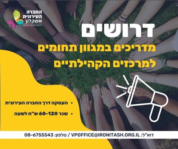 הפעילות במרכזים הקהילתיים מתרחבת: החברה העירונית מחפשת מדריכים בוגרים להעברת חוגים במרכזים הקהילתיים בכל התחומים. עדיפות לבעלי תעודת הדרכה, מעל גיל 18. והשכר? מעולה! מחכים לכם